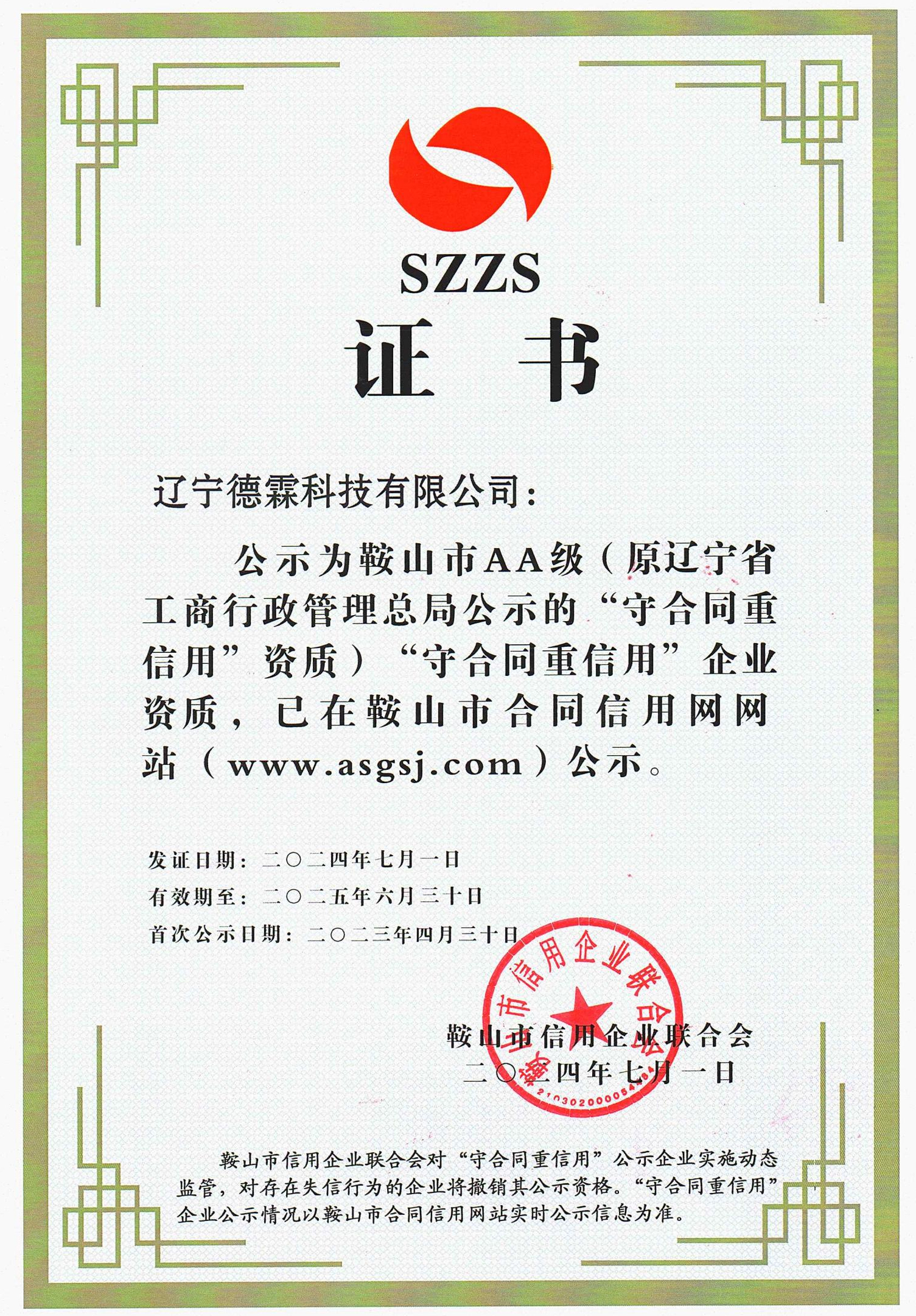 公司取得了鞍山市AA級”守合同重信用“企業(yè)資質(zhì)