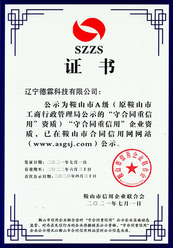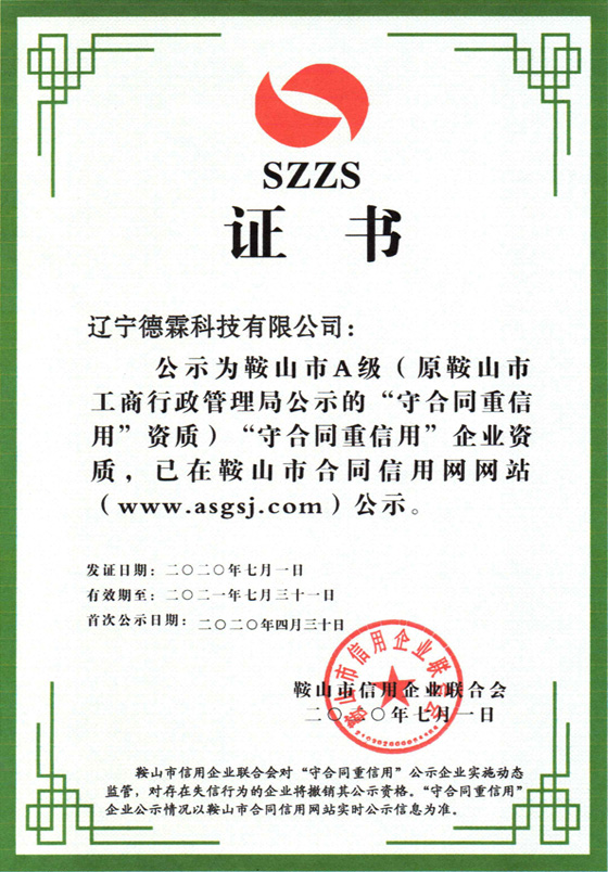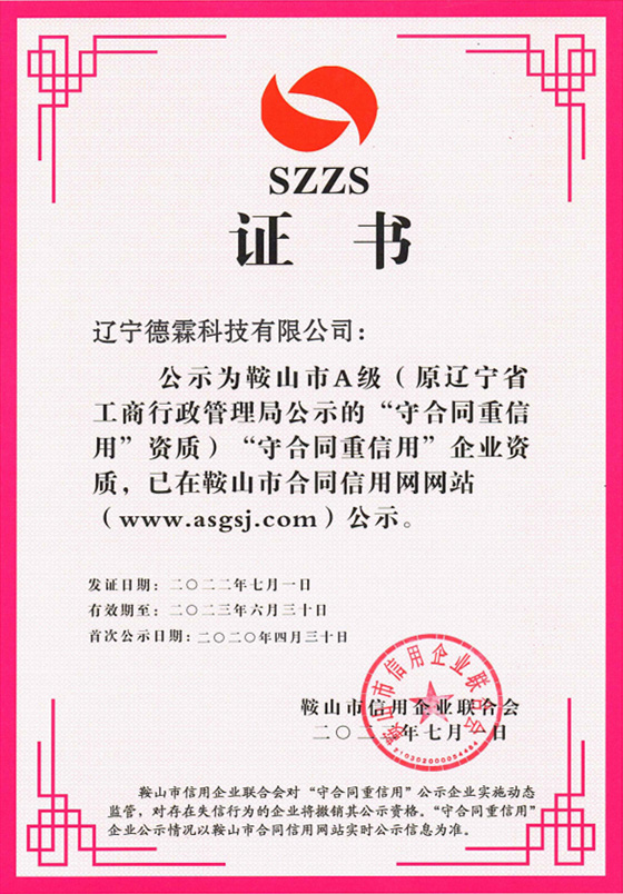 公司取得了鞍山市A級”守合同重信用“企業(yè)資質(zhì)